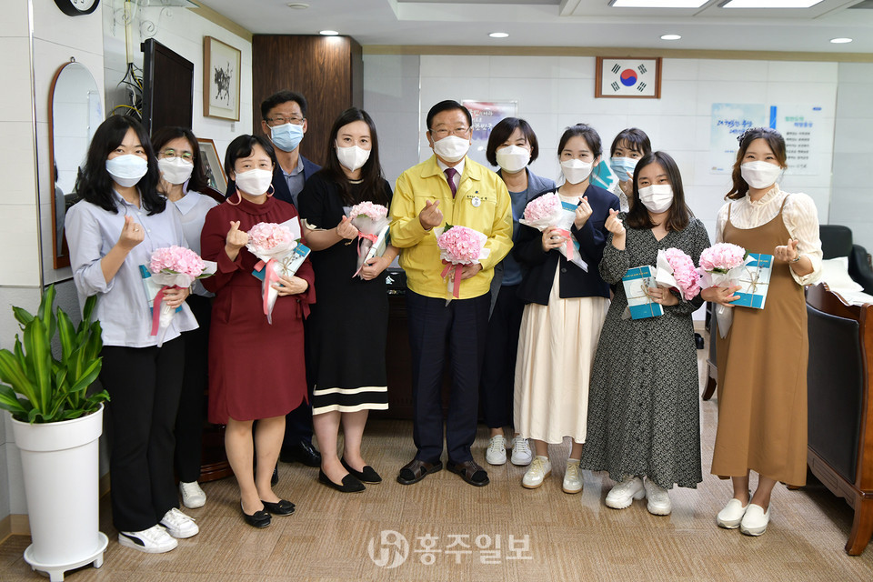 홍성군은 임산부의 날(10월 10일)을 앞두고 직장 내 임산부 배려 문화를 확산하고 소중한 생명의 잉태를 축하하고자 6일 임산부 직원들과 소통의 자리를 마련했다.<사진>