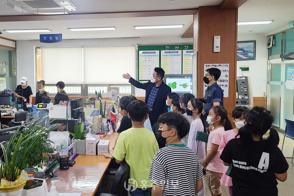 갈산초등학교(교장 장경순) 학생들이 지난달 29일 갈산면 행정복지센터에 방문해 탐방 학습을 체험했다.<사진>