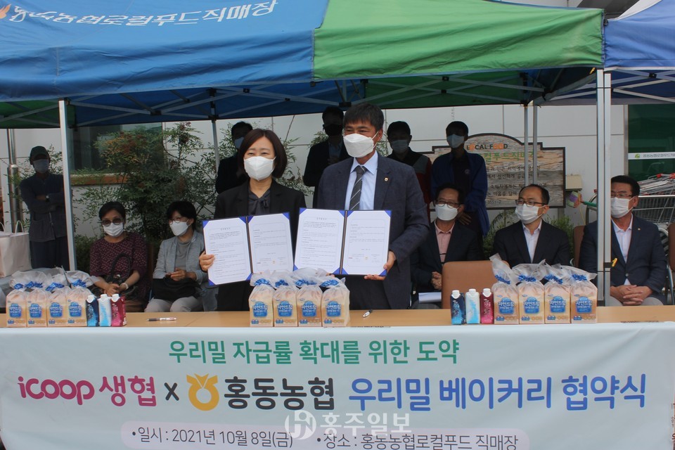 이날 홍동농협과 아이쿱생협은 △소비자 기호에 맞는 맛과 품질의 제품개발 △국산밀을 활용한 베이커리 생산·유통 △국산밀 소비 확대를 위한 홍보활동 등의 협력을 약속했고, 아이쿱생협은 홍동농협 로컬푸드 직매장을 시작으로 유통망을 점차 확대해 나갈 계획이다.