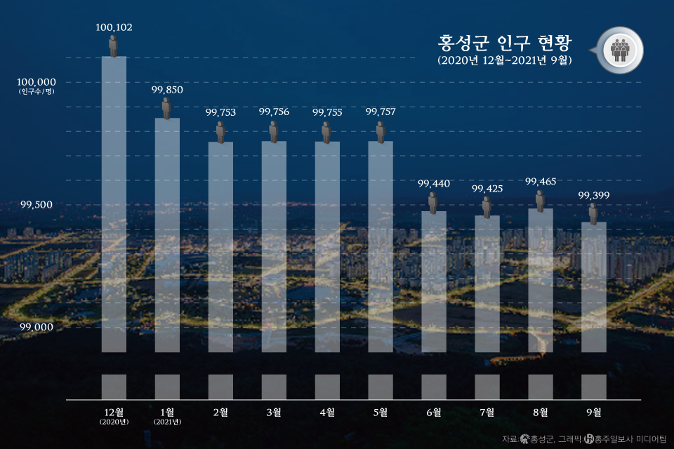 홍성군 인구수가 올해 꾸준히 감소하고 있는 것으로 밝혀졌다. 군의 따르면 지난해 12월 31일 기준 홍성군 인구수는 10만 102명(남 4만 9796명, 여 5만 306명)을 기록하며 10만 명대로 회복했다.