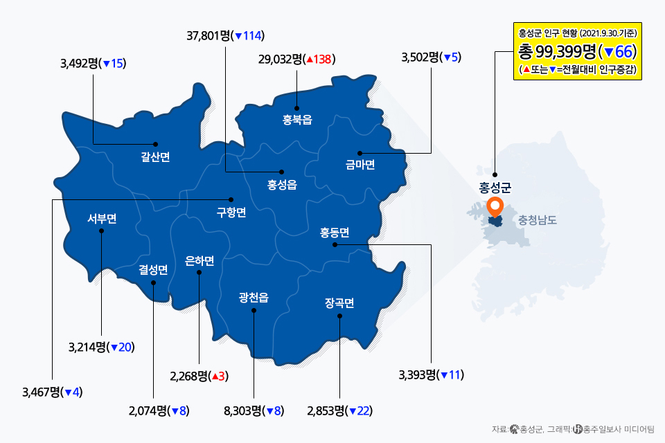 9월 홍성군 인구수 읍면별 현황은 △홍성읍 3만 7801명(남 1만 8742명, 여 1만 9059명) △광천읍 8303명(남 4102명, 여 4201명) △홍북읍 2만 9032명(남 1만 4536명, 여 1만 4496명) △금마면 3502명(남 1799명, 여 1703명) △홍동면 3393명(남 1696명, 여 1697명) △장곡면 2853명(남 1362명, 여 1491명) △은하면 2268명(남 1149명, 여 1119명) △결성면 2074명(남 1024명, 여 1050명) △서부면 3214명(남 1577명, 여 1637명) △구항면 3492명(남 1750명, 여 1742명) △갈산면 3467명(남 1759명, 여 1708명)으로 11개 읍·면 중 홍북읍(138명 증가)과 은하면(3명 증가)이 지난달 대비 인구수가 증가했고, 홍성읍(-114)을 비롯한 나머지 읍면은 인구수가 감소했다.