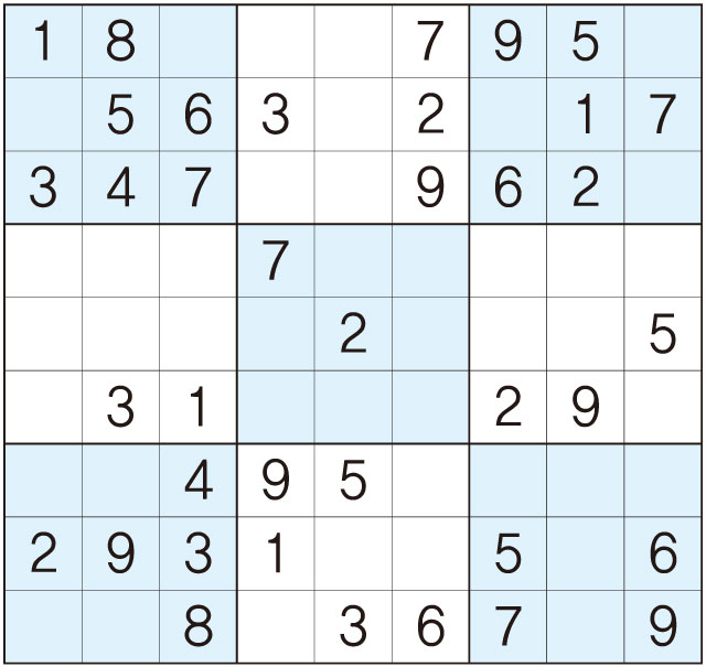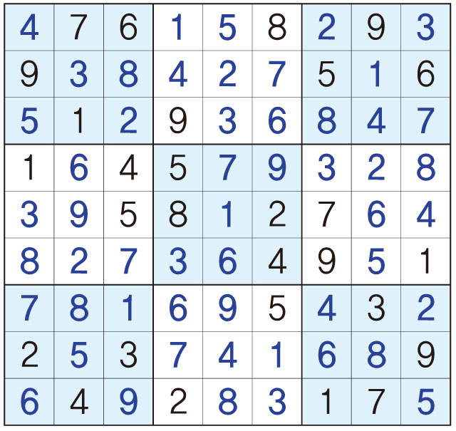 3. 큰 정사각형(9x9) 안에 있는 작은 정사각형(3x3) 안에는 숫자 1~9가 각 한 번씩 들어간다.