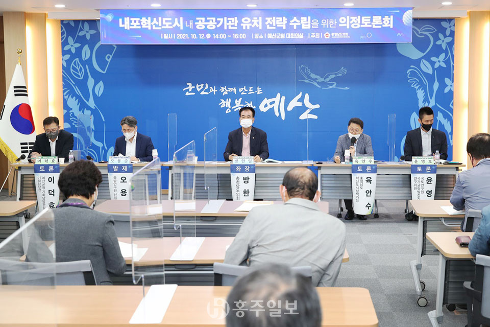 충남도의회(의장 김명선)는 지난 12일 예산군청 대회의실에서 ‘내포혁신도시 내 공공기관 유치 전략수립’을 주제로 의정토론회를 개최했다.