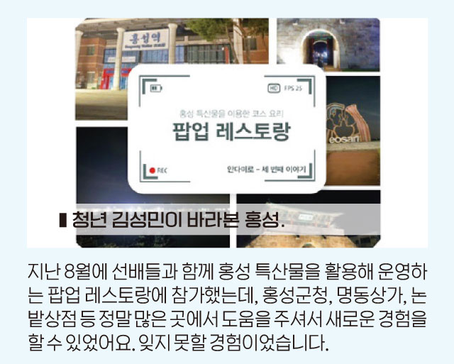 고령화 사회에 접어든 홍성군, 여전히 홍성에 계속 남아 정착하고 열심히 일하고 있는 청년들도 많음을 알리고 청년의 시선으로 바라본 홍성에 대한 이야기를 들려주고자 한다.