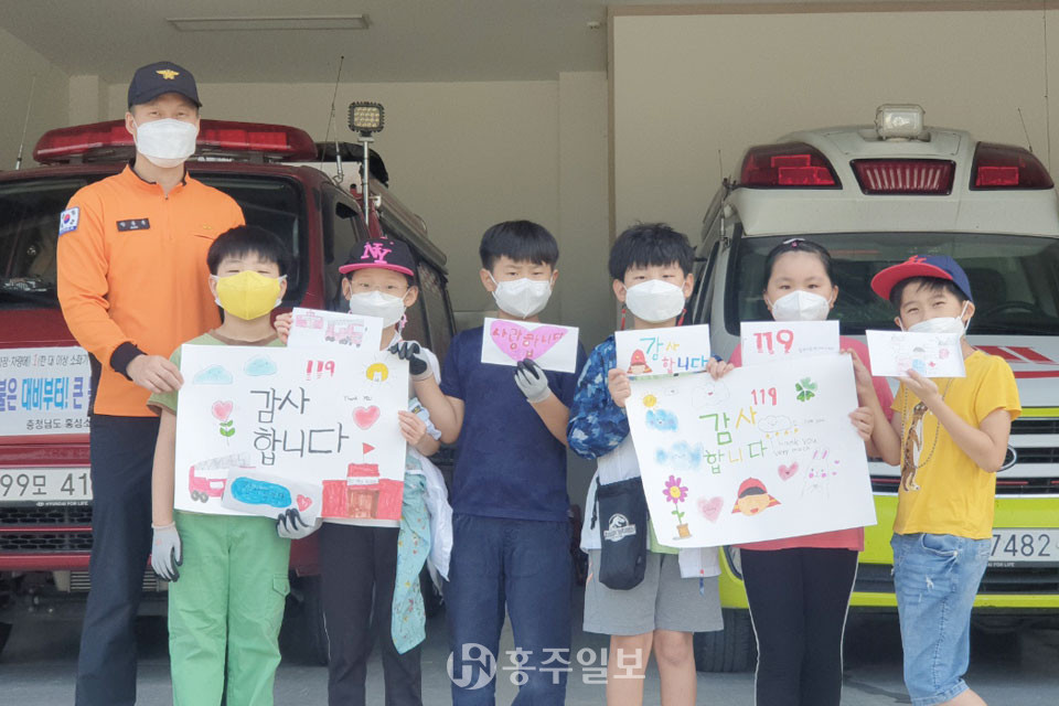 지난 1일 서부초등학교 3학년 학생 6명은 홍성소방서(서장 김성찬) 서부지역대를 방문해 코로나19 등으로 고생하는 소방대원들에게 감사의 선물과 편지를 전달했다.