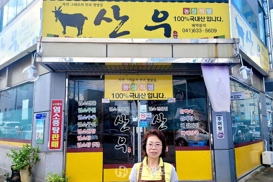 김영호(58) 대표의 고향은 예산군 삽교읍으로 남편 따라 홍성에 정착했고, 지금의 이 자리에서 장사를 시작한 지는 8년이 되어 간다. 처음엔 감자탕으로 시작했다가 염소고기로 메뉴를 변경했다. 다른 무엇보다도 이곳 염소 요리 맛의 비법은 김 대표의 남편이 흑염소 농장을 직접 운영하는 덕분에 엄선된 재료를 바로 수급할 수 있다는 강점에 있다. 맛이 가장 뛰어나다는 20㎏ 암컷 염소만을 사용해 칡, 뽕나무, 업나무 등 각종 약재들을 넣어 요리하기 때문에 염소 특유의 냄새가 나지 않아 처음 접하는 사람도 거부감이 들지 않는다. 그래서 ‘산우’에서 염소고기를 처음 맛본 사람은 그 맛에 반해 거듭 방문하는 단골손님이 된다고 한다.