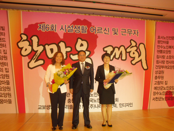 장수노인요양원(원장 박현주·사진 왼쪽)은 지난 17일 롯데부여리조트에서 열린 제6회 노인생활시설 어르신 및 종사자 한마음대회 기념 우수기관시상식에서 시설생활어신들의 안녕과 행복을 위한 프로그램개발과 실천을 통해 어르신들의 생활 만족도증진에 기여한 공으로 충청남도지사상을 수상했다.