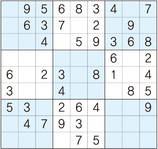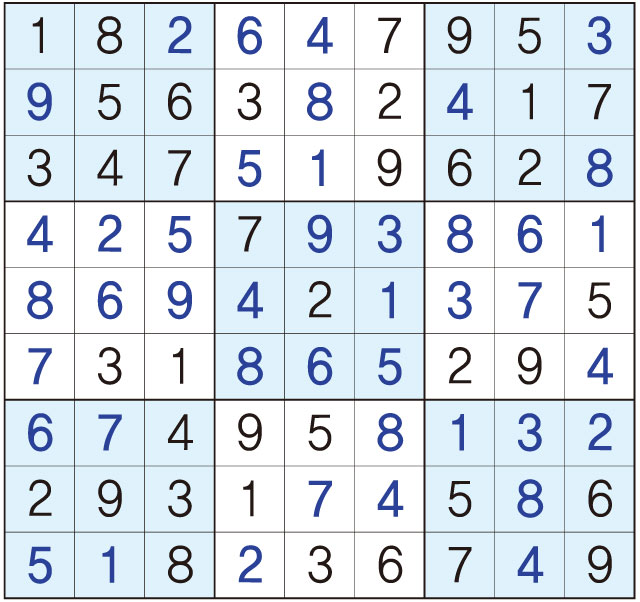 3. 큰 정사각형(9x9) 안에 있는 작은 정사각형(3x3) 안에는 숫자 1~9가 각 한 번씩 들어간다.