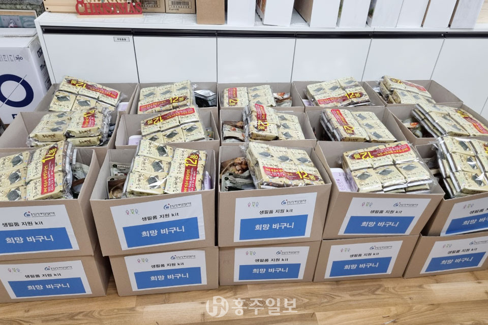 홍성군장애인종합복지관(관장 복천규)이 복지사각지대에 놓인 취약계층 지역장애인을 위한 맞춤형 키트를 제작해 전달했다. 이번에 전달된 키트는 ‘희망 바구니’로 즉석식품과 저장식품 등의 식료품과 생필품이 담겨 있다.