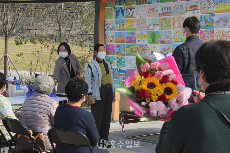 이날 할머니화가 프로젝트를 수료한 남문동 마을 작가는 임문자, 박금자, 이송연, 염정숙, 이화자, 김명순, 김길자, 가만석 등 8명이며 한 명씩 호명돼 꽃과 수료증을 수여받았다.<사진>