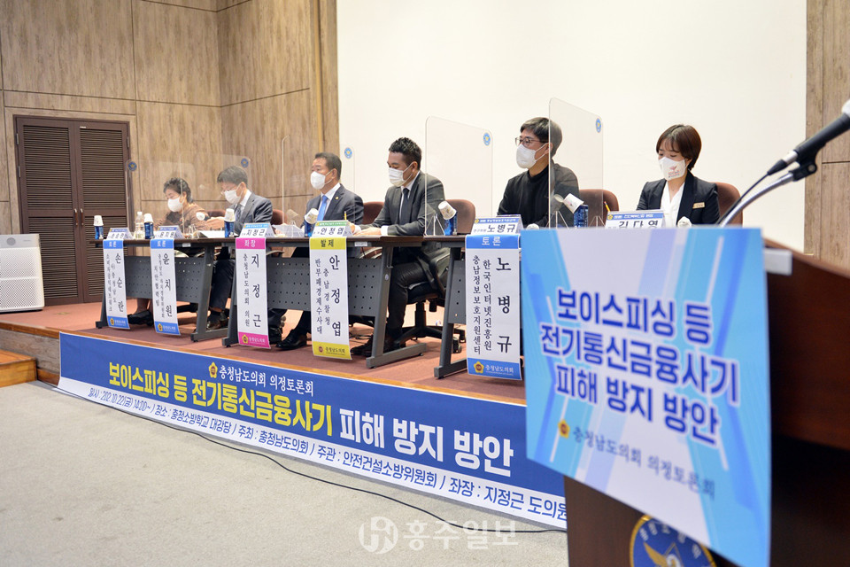 충남도의회(의장 김명선)는 22일 충청소방학교에서 ‘보이스피싱 등 전기통신금융사기 피해 방지 방안 마련’을 주제로 의정토론회를 개최했다.<사진>