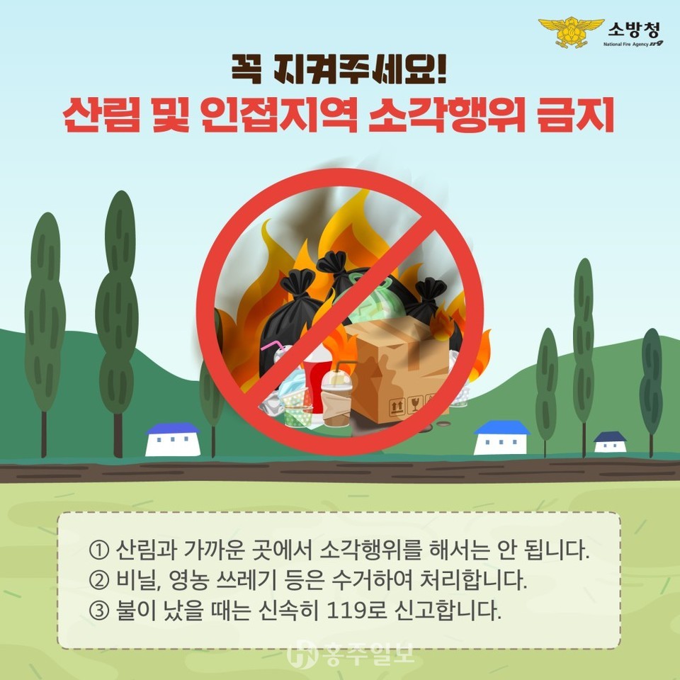홍성서에 따르면 논·밭두렁이나 농업 부산물, 쓰레기 등을 불법 소각할 경우 건조한 기후와 바람의 영향으로 자칫 큰 화재로 이어져 인명피해뿐 아니라 대형 산불로 이어질 수 있다. 부득이한 경우 산림이나 산림과 인접한 지역(100m 이내)을 제외하고 지자체 산림부서의 허가를 받은 후 마을 공동으로 실시해야 한다.