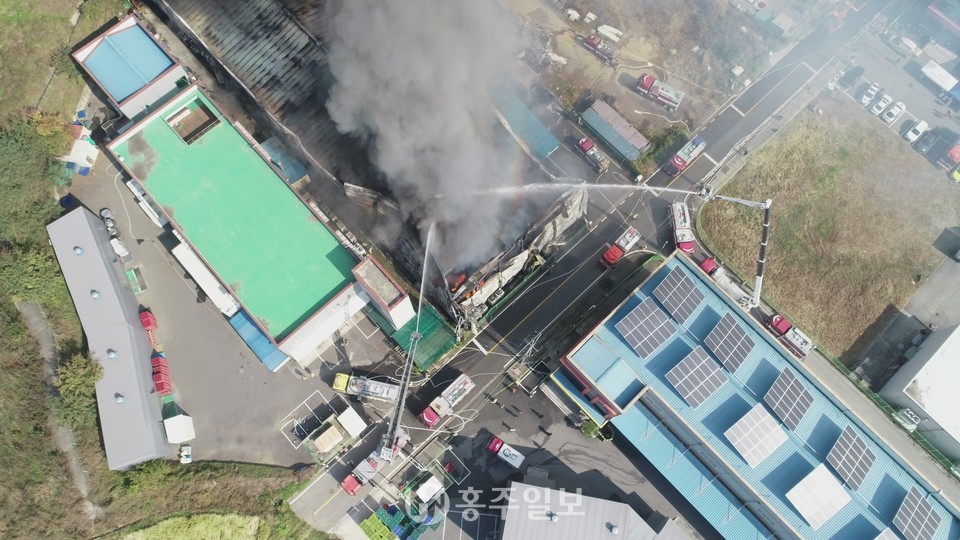 홍성소방서(서장 김성찬)는 지난 24일 11시 35분경 홍성군 광천읍 공장화재 현장에서 소방 드론을 활용해 화재진압을 실시했다고 밝혔다.