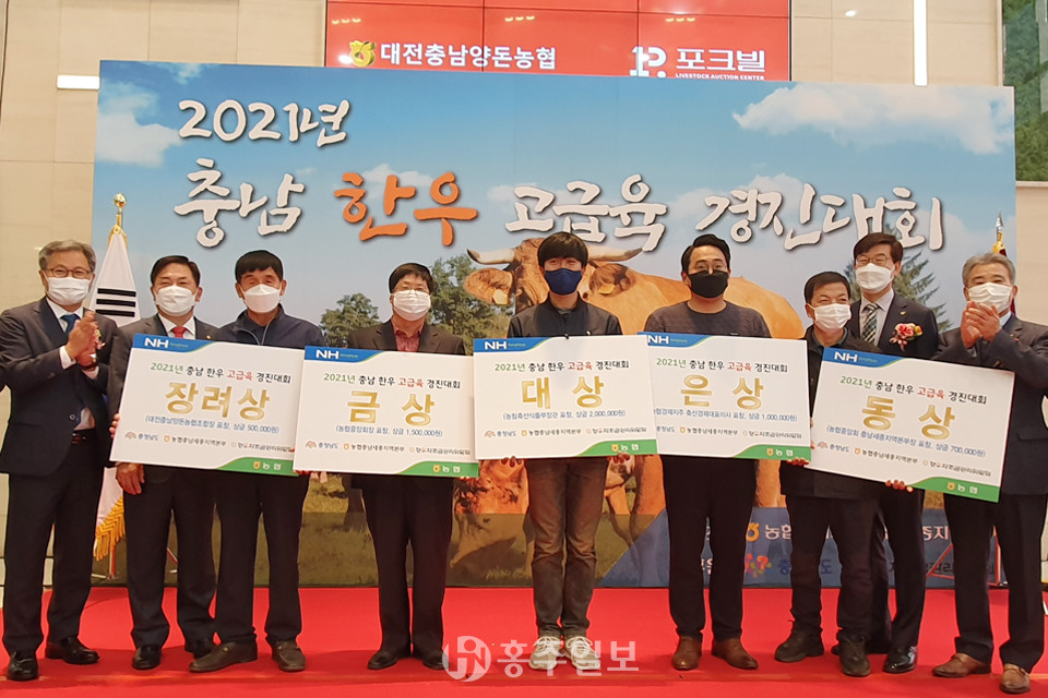 충남세종농협(본부장 길정섭)은 27일 충청남도, 한우자조금관리위원회와 공동으로 ‘2021년 충남 한우 고급육 경진대회’를 개최하고 세종공주축협 이수명 조합원이 출품한 한우를 충남 최고 한우육으로 선정해 시상했다.<사진>