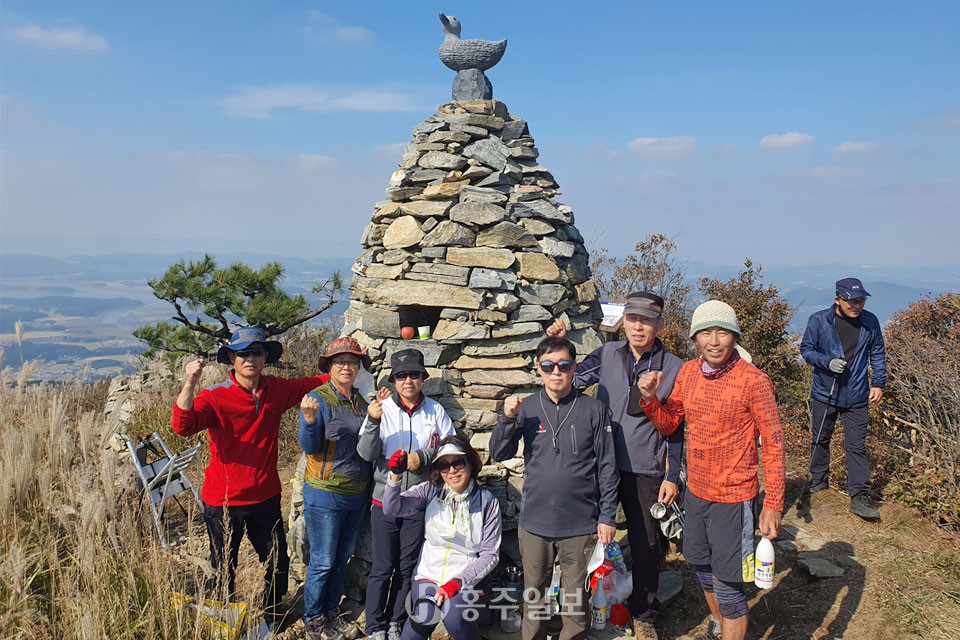 우공이산(愚公移山)이라는 사자성어처럼 ‘오서산에 평화를 기원하는 탑을 만들고 싶다’는 바람 하나로 수년간 지게에 돌을 손수 지고 오서산 정상까지 올라 결국 탑을 완성한 복 씨의 의지는 보는 이로 하여금 경이로움까지 느끼게 한다. 사진은 등산객들과 기쁨을 함께한 복성규 씨의 모습(왼쪽에서 일곱 번째).