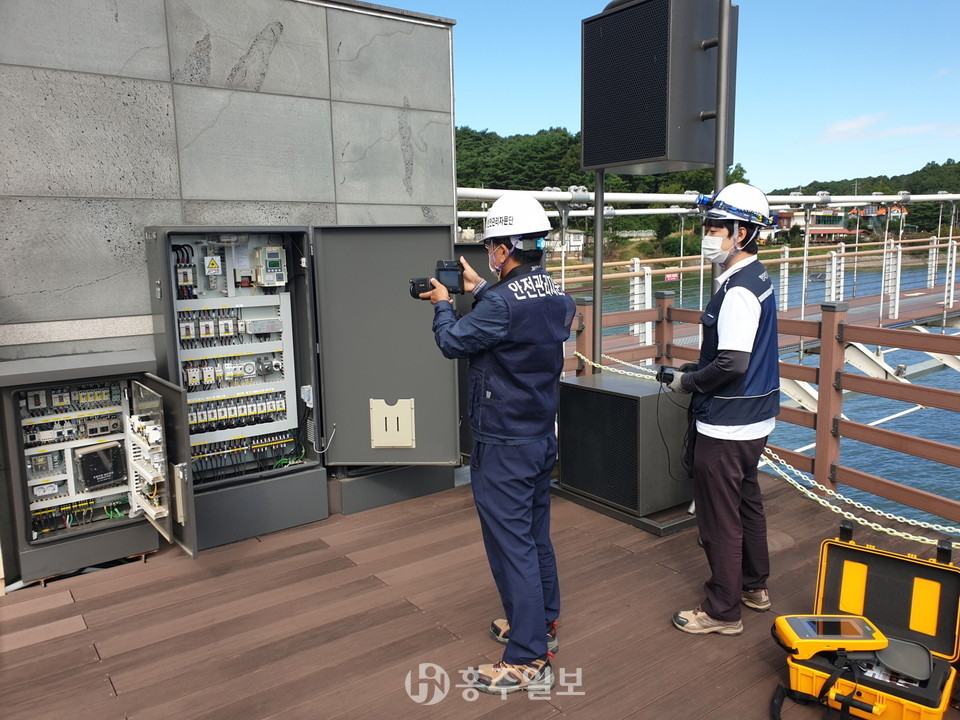 예산군은 13일 예당호 출렁다리에서 충청남도와 함께 국가안전대진단 현장점검을 실시했다.<사진>