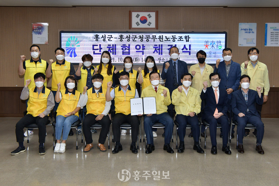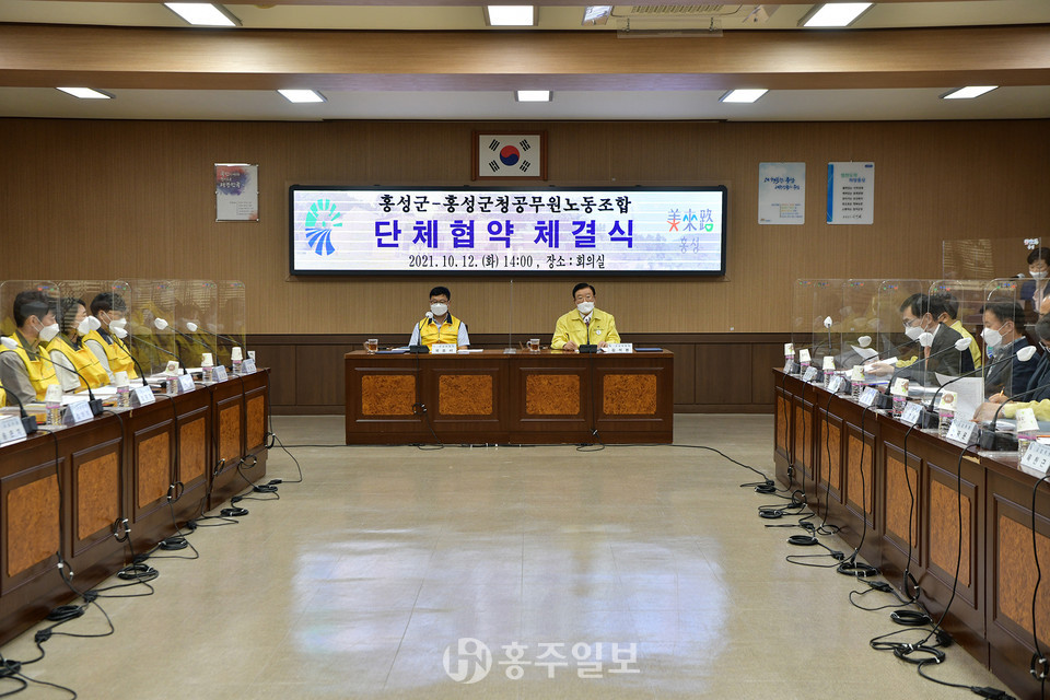 홍성군(군수 김석환)과 홍성군청공무원노동조합(위원장 국응서)이 지난 12일 상호 존중과 이해를 바탕으로 군정발전을 위한 맞손을 잡았다.<사진> 군은 지난 12일 김석환 군수와 국응서 노조위원장을 비롯한 노·사 양측 교섭위원 20명이 참석한 가운데 단체협약을 체결했다.