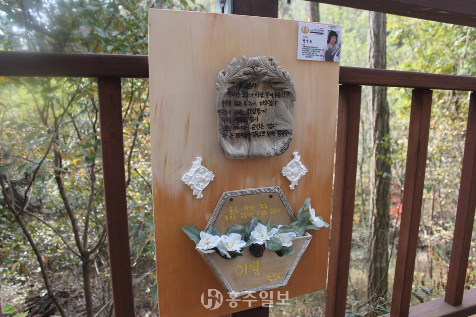 (사)한국문인협회 홍성지부(지부장 황정옥·이하 문협)가 지난달 30일 용봉사 방면 내포 사색길에서 제3회 용봉산 등산로 숲속 시화전인 ‘내포 사색길에서 만나는 시를 담은 도자기&그린플렌테리어 작품전’ 개회식을 진행했다.