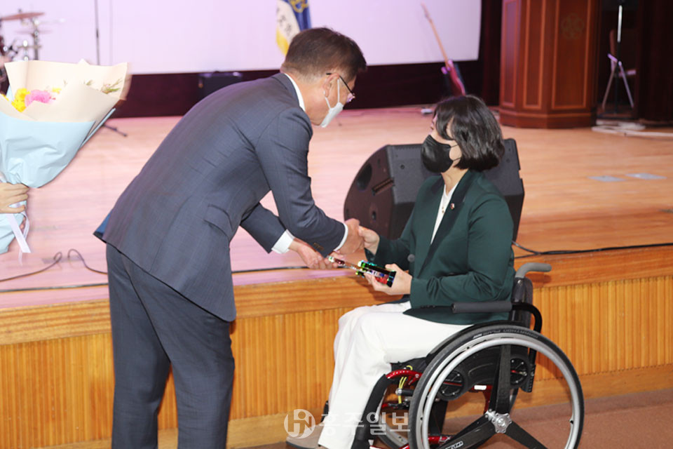 이날 행사에 참석한 이종화·조승만·황영란 도의원은 충남문화원장연합회장 공로패를 수상했다. 그런데 이종화·조승만 도의원은 무대 위로 올라 함께 공로패를 수상했지만 휠체어를 탄 황영란 도의원은 무대에 오르지 못하고, 다른 수상자들과 별도로 무대 아래에서 공로패를 수상했다.<사진>