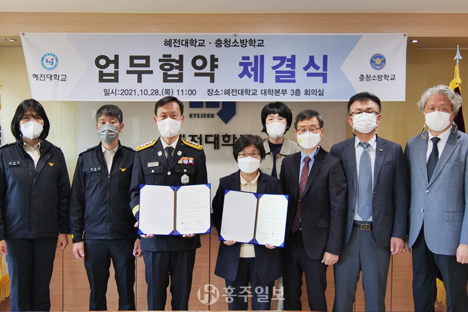 혜전대학교(총장 이혜숙)는 지난달 28일 혜전대학교 본관 3층 회의실에서 이혜숙 총장과 방상천 교장 등이 참석한 가운데 충청소방학교(교장 방상천)와 업무협약식을 진행했다.<사진>