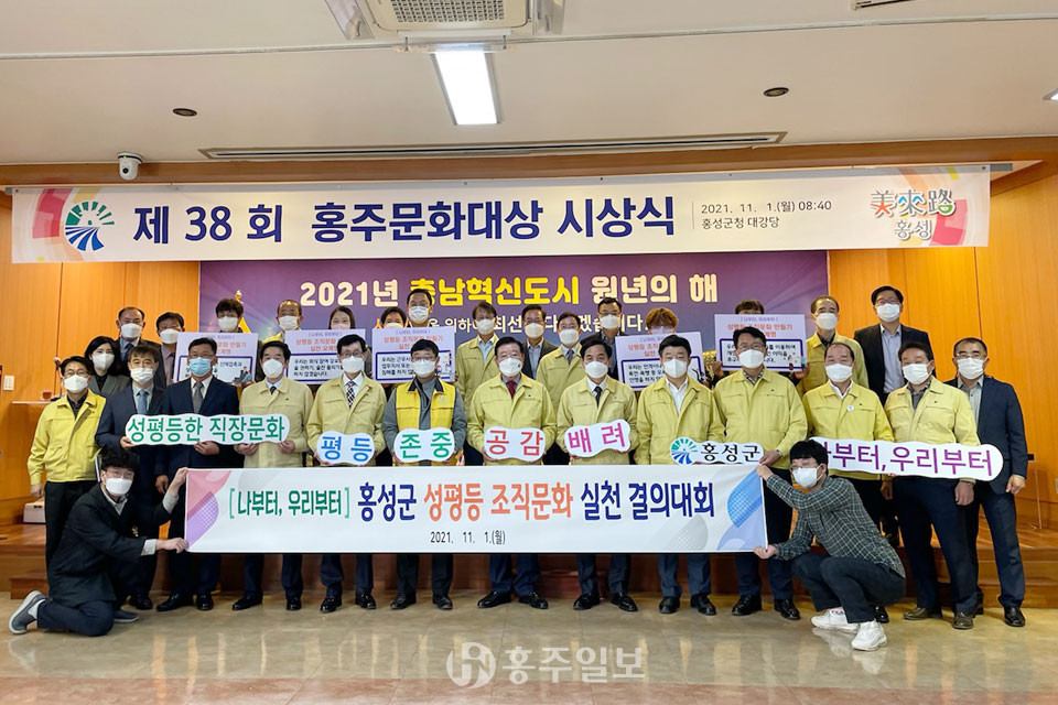 홍성군은 지난 1일 조직 내 성희롱, 성차별을 예방하고 모두가 평등한 일터를 만들기 위한 ‘성평등 실천 5계명’을 발표하고 성평등 조직문화 실천 결의대회를 개최했다.<사진>