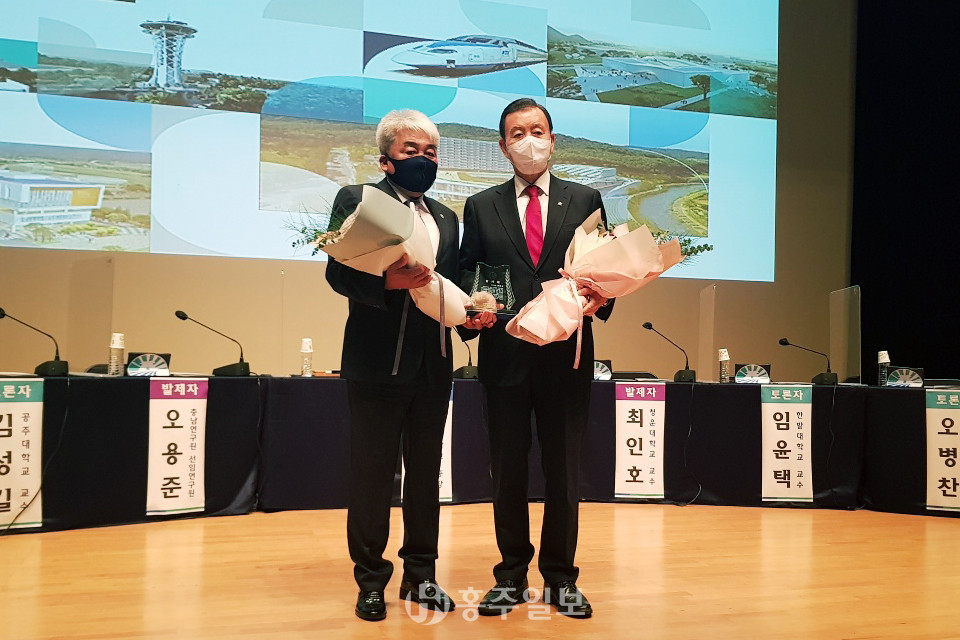 홍문표 국회의원(국민의힘, 홍성·예산)이 지난 9일 홍성군이 주최하고 홍성군지역발전협의회가 주관한 ‘혁신도시 완성과 지역균형 발전을 위한 토론회’에서 충남 혁신도시 지정과 국가균형발전에 기여한 공로로 감사패를 수상했다.<사진>
