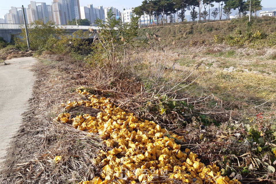내포신도시 아파트단지 주변을 흘러가는 신경천에서 무단 투기된 음식물 쓰레기가 포착됐다. 날씨가 선선한 11월 가을, 제철을 맞은 배가 포장도 벗겨지지 않은 채 버려져 눈살을 찌푸리게 한다. 쓰레기를 함부로 버리면 안 된다는 건 어릴 때부터 배우는 기본 중의 기본이지만 솔직히 땅에 쓰레기 한 번 버리지 않은 사람이 있을까. 그래도 이건 좀…