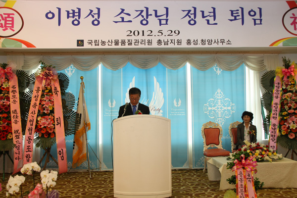 염창선 홍성군 부군수를 비롯해 국립농산물품질관리원 전용투 충남지원장 등 내외귀빈 100여명이 참석한 가운데 진행된 퇴임식에서 이병성 소장은 전용투 지원장으로부터 녹조근정훈장을 받았으며 각종 공로패와 감사패가 수여됐다.