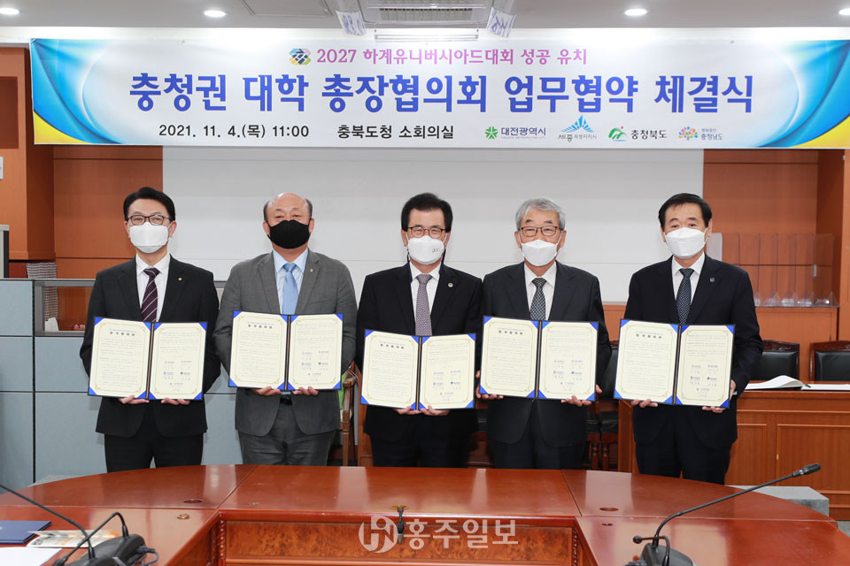 청운대학교(총장 이우종)는 지난 4일 충청권대학을 대표해 (사)2027하계유니버시아드대회 충청권공동유치위원회(위원장 이시종)·충청권대학 총장협의회와 대회의 성공적 유치를 위한 업무협약식을 가졌다.<사진>