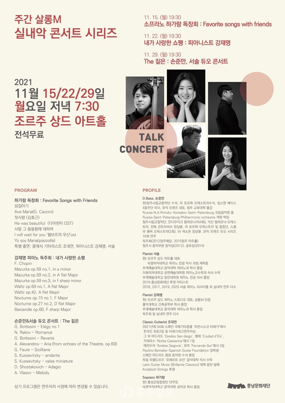 홍성군을 중심으로 활동하는 젊은 예술가들이 모인 클래식 실내악 단체 ‘살롱M’이 조르주 상드 아트홀에서 지난 15일부터 3주간 매주 월요일 오후 7시 30분 각기 다른 주제로 월요 콘서트를 열고 있다.