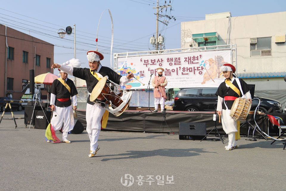 지난 14일 광천전통시장에서는 “‘보부상 행렬 재현’ 및 ‘마당놀이’ 한마당”이 열려 지나가는 손님들의 발길을 잡았다. 사진은 공연 중 신명나는 장구 독주 모습.
