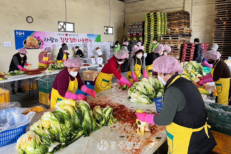 농협 홍성군지부(지부장 윤용주)는 19일 홍북농협 경제사업장에서 국민과 함께하는 농촌봉사활동의 일환으로 ‘우리농산물로 나누는 이웃사랑 캠페인! 사랑의 김장김치 나눔행사’를 열었다.<사진>