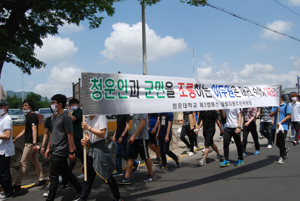 청운대학교 제2캠퍼스설립지원추진위원회(위원장 오관섭. 이하 설립추진위)는 지난 5일 1800여명의 재학생들이 참가한 가운데 청운대에서 홍성군청까지 홍성읍 시가지 일원에서 침묵의 가두시위를 벌였다. 오관섭 설립추진위 위원장을 비롯한 학생대표단은 김석환 군수와 청운대 이전 반대특위 홍성군의회 이두원 의원을 잇달아 면담하고 학생들의 입장을 담은 항의 성명서를 전달했다.