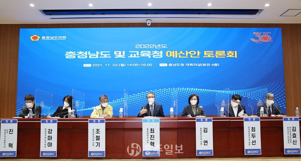 충남도의회(의장 김명선)가 내년 재정운영 방향에 대한 전문가와 주민 의견을 수렴하기 위해 지난 22일 충남도청 대회의실에서 ‘2022년도 충청남도 및 교육청 예산안 토론회’를 개최했다.<사진>