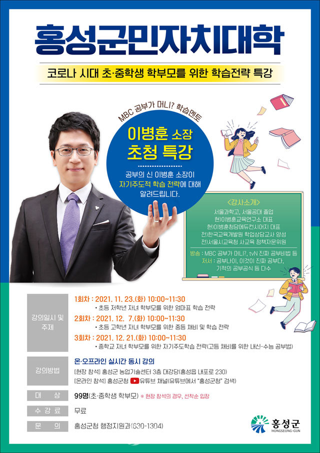 군은 “현장 강연과 동시에 직접 참여할 수 없는 군민을 위해 홍성군청 유튜브 채널에서도 자치대학 강의가 라이브 방송으로 진행될 예정”이라고 밝혔다.