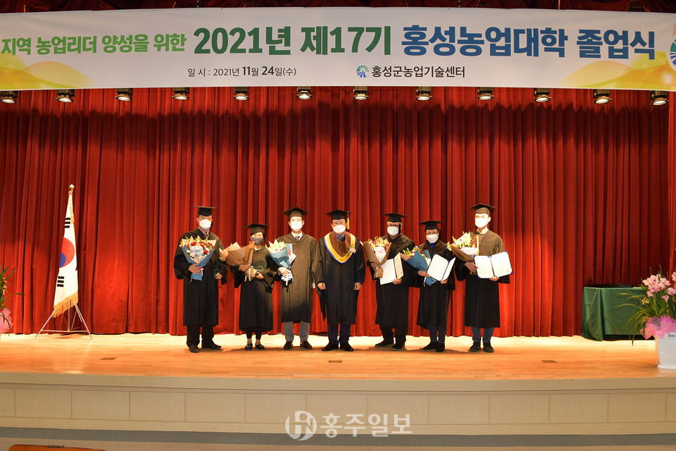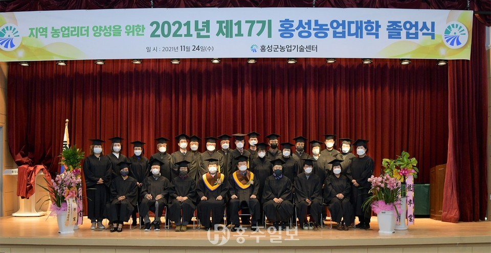 홍성군농업기술센터는 지난 24일 ‘2021년 제17회 홍성농업대학 졸업식’을 갖고 지역농업의 미래를 이끌어갈 31명의 졸업생을 배출했다.<사진>