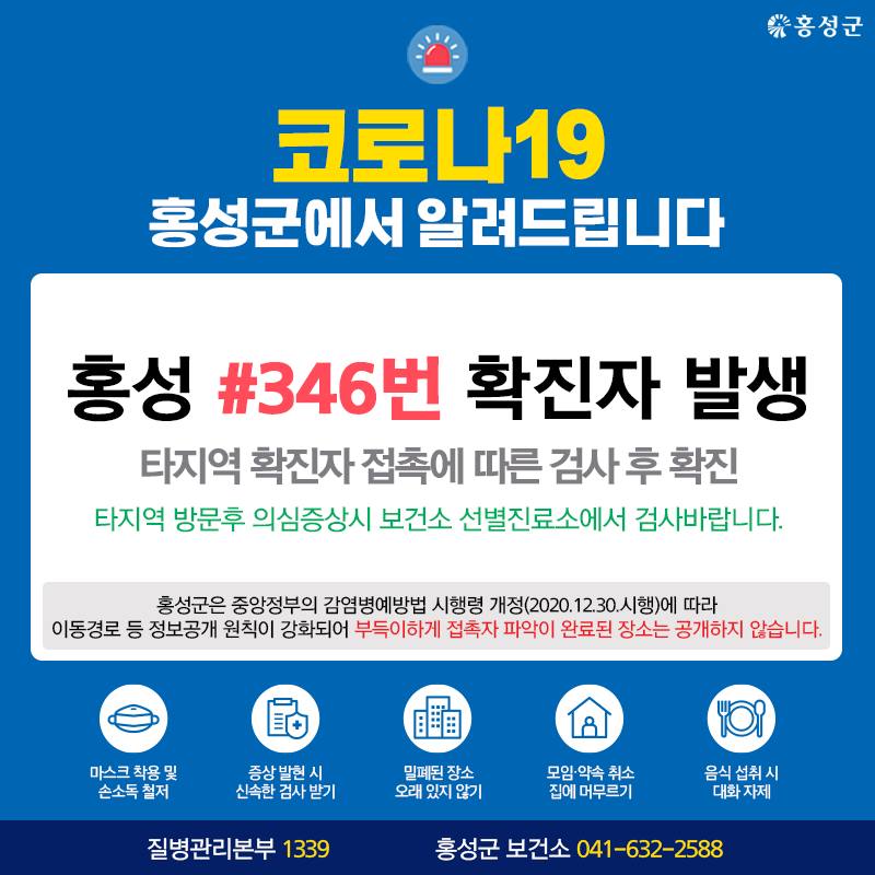 홍성 #346번 확진자 발생 - 타지역 확진자 접촉에 따른 검사 후 확진 • 증상발현시 신속한 검사받기 • 마스크 착용 및 손소독 철저 Tag #홍성군 #코로나19 #확진자 #발생 저작권자 © 홍주일보 무단전재 및 재배포 금지 한기원 기자 다른기사 보기 페이스북 카카오톡 URL복사 기사공유하기