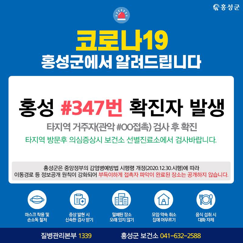 홍성 #347번 확진자 발생 - 타지역 거주자(관악 #OO접촉) 검사 후 확진 • 증상발현시 신속한 검사받기 • 마스크 착용 및 손소독 철저 Tag #홍성군 #코로나19 #확진자 #발생 저작권자 © 홍주일보 무단전재 및 재배포 금지 한기원 기자 다른기사 보기 페이스북 카카오톡 URL복사 기사공유하기