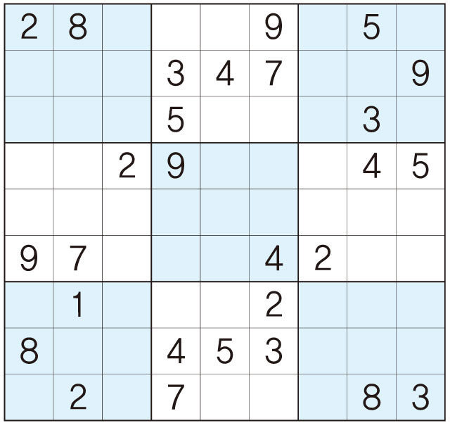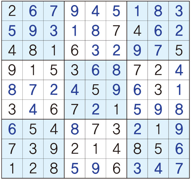 3. 큰 정사각형(9x9) 안에 있는 작은 정사각형(3x3) 안에는 숫자 1~9가 각 한 번씩 들어간다.