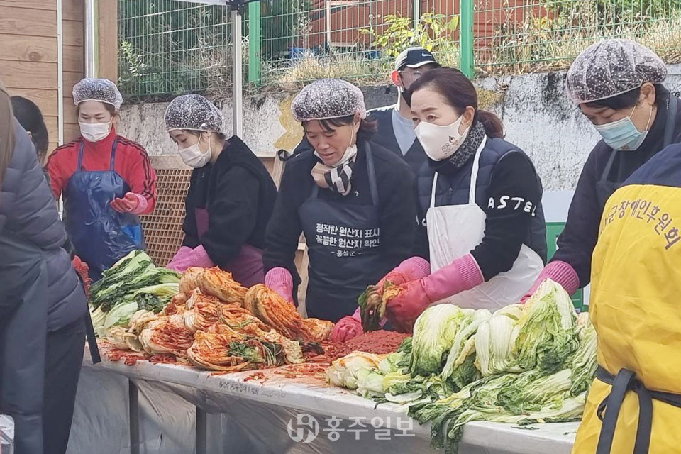 홍성군장애인후원회(회장 장준표)는 지난 24일 홍성군장애인종합복지관에서 40여 명이 참여해 관내 재가장애인들을 위한 ‘사랑의 김장 나눔 행사’를 열고 300포기 김장 김치를 지체장애인협회 외 7개 단체에 전달을 했다.<사진>