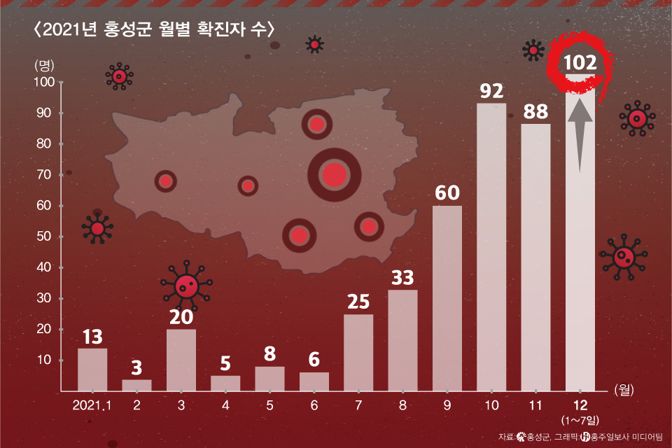 홍성은 이달 들어 지난 1일부터 7일까지 일주일 새 100명이 넘는 추가 확진자가 발생하면서 방역에 비상이 걸렸다. 특히 지난 7일에는 △증상발현에 의한 검사 △확진자의 자가격리 중인 가족 △타지역 확진자 접촉 등 하루에 총 40명이 무더기로 확진되기도 했다.