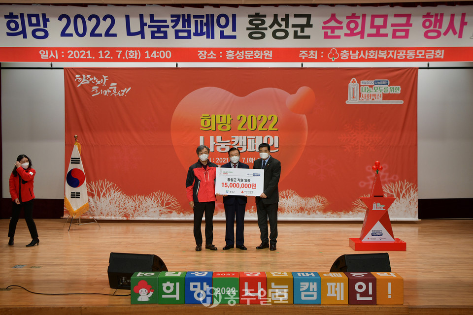 지난 7일 홍성문화원에서 열린 ‘희망 2022 나눔캠페인 순회모금’ 행사에서는 김석환 군수를 비롯한 홍성군청 전 공직자들이 1500만 원의 성금을 기탁하며 자발적인 기부문화 분위기 조성에 앞장섰다.<사진>