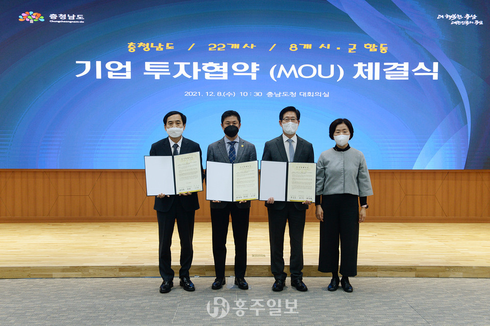 홍성군과 ㈜아바비젼(대표 박재준)이 8일 충남도청 대회의실에서 32억 규모의 투자유치 협약을 체결했다.<사진>