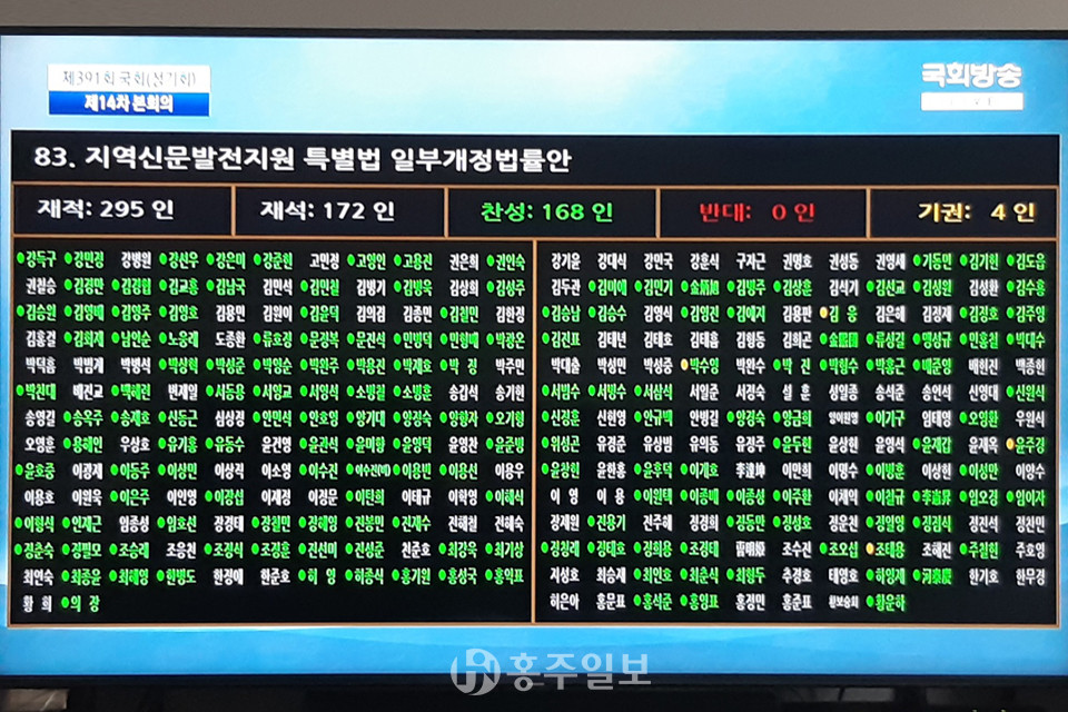 국회는 9일 오후 정기회 14차 본회의를 열고 지역신문발전법을 처리했다. 투표결과 재석 172명 중 찬성 168명, 기권 4명이다.