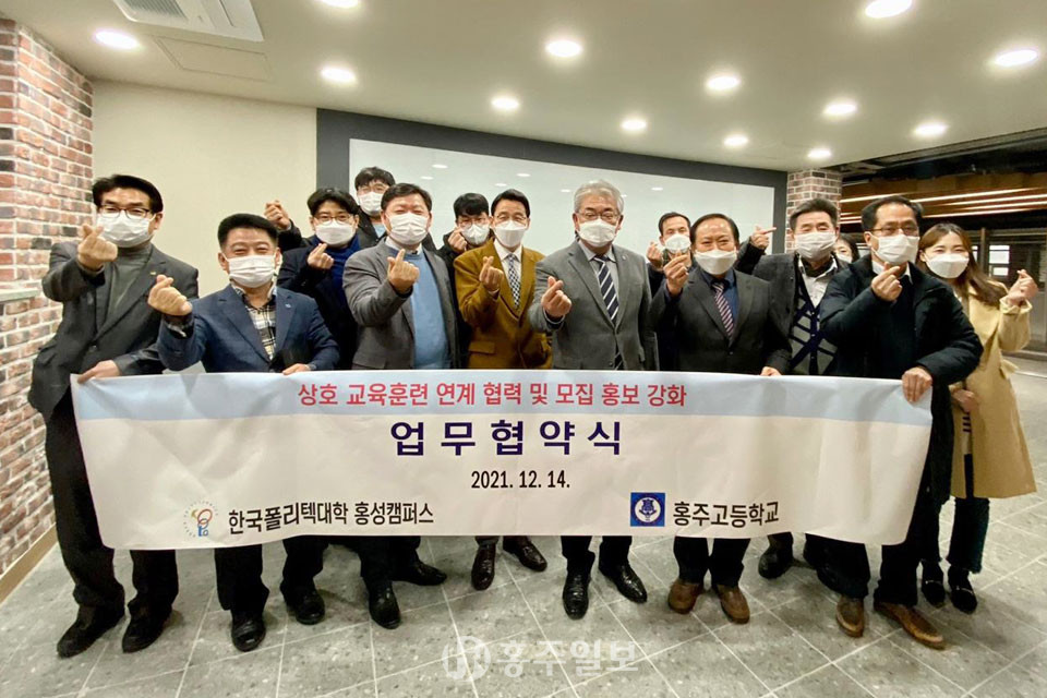 한국폴리텍대학 홍성캠퍼스(학장 장우영)와 홍주고등학교(교장 한영우)는 지역인재육성을 위한 교육훈련 연계 협력과 모집홍보 강화를 위해 지난 14일 대학 회의실에서 업무협약을 체결했다.