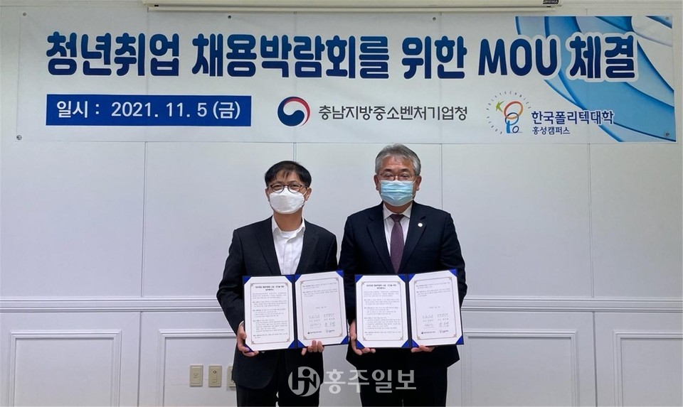 한국폴리텍대학 홍성캠퍼스(학장 장우영)는 지난 5일 충남도내 중소기업 일자리 해소를 위한 충남지방중소벤처기업청(청장 신성식)과 업무협약을 체결했다.<사진>