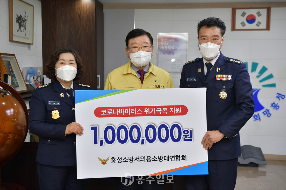 홍성소방서 의용소방대연합회(연합회장 김문석)가 지난 16일 군청 군수실에서 코로나19 재 확산으로 어려움을 겪고 있는 시민들의 재난 극복을 위해 의용대연합회원들이 자발적으로 마음을 모은 성금 100만 원을 기부했다.<사진>