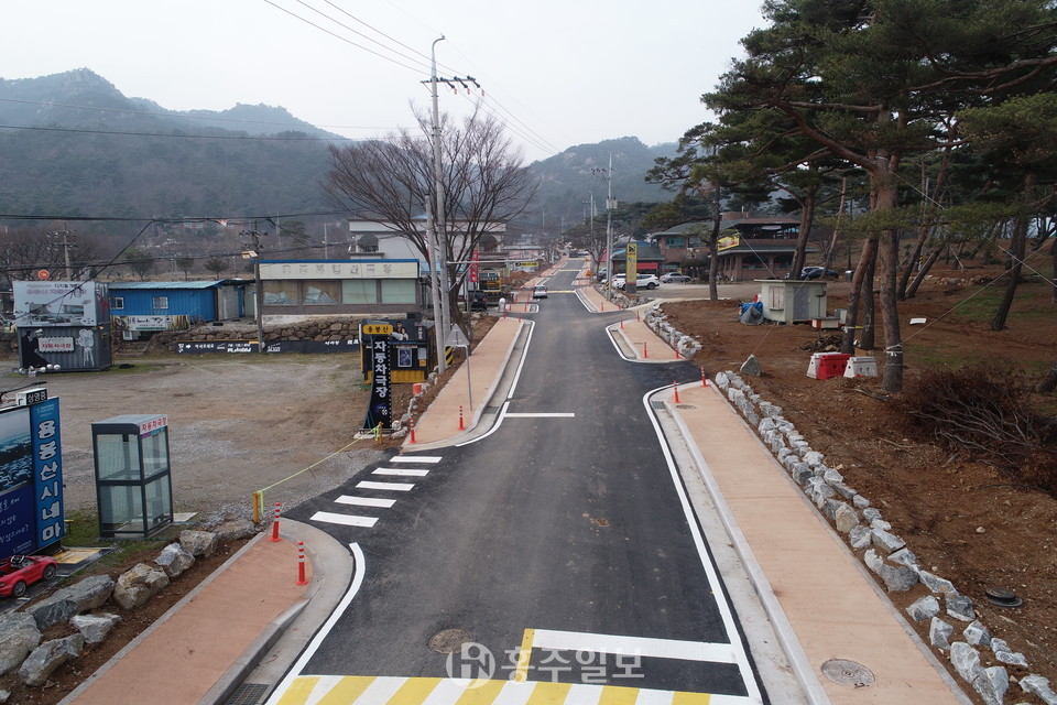 이에 군은 총사업비 21억 3000만 원을 투입해 지난 2월부터 사업에 착공했고, 총연장 450m, 폭 10m의(양쪽 보도 4m 포함) 도로 확·포장 공사를 완료했다.
