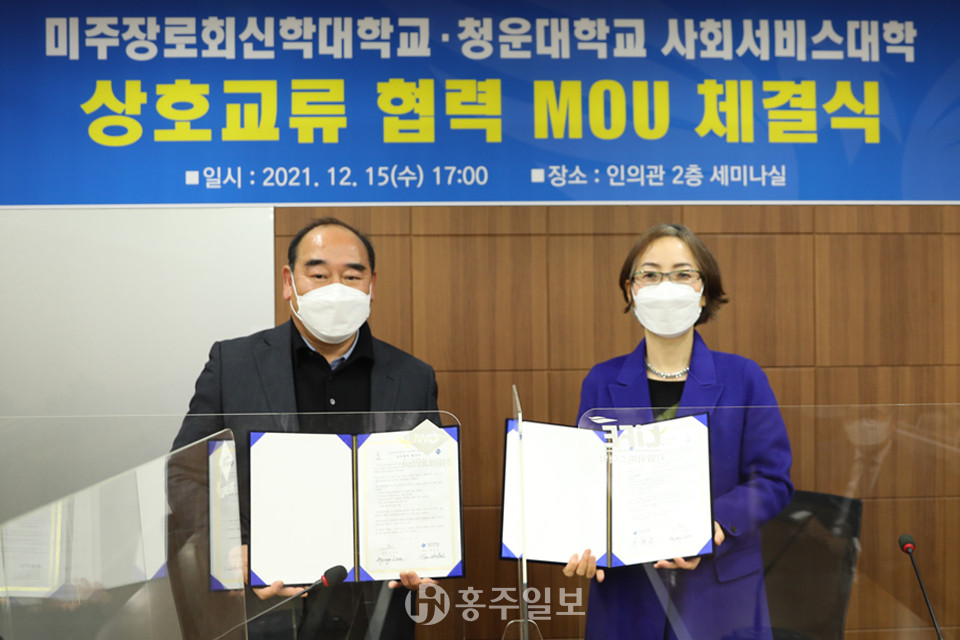 청운대학교(총장 이우종) 사회서비스대학(학장 박현옥)과 미주장로회신학대학교(총장 이상명) 신학대학(학장 이명철)이 평생교육의 진흥과 양 기관의 발전을 위한 유기적 협력체계를 구축하기 위한 업무협약을 체결했다.<사진>