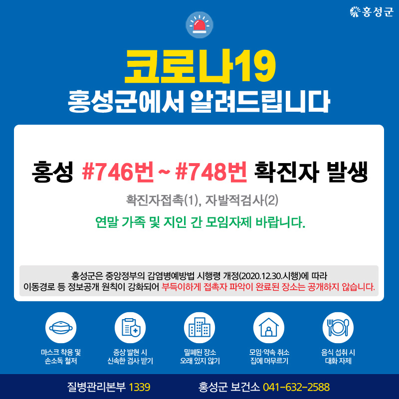 홍성 #746번 - #748번 확진자 발생 확진자 접촉 (1), 자발적 검사 (2) 등 총 3명 검사 후 확진. 연말 가족 및 지인 간 모임자제 바랍니다 Tag #홍성군 #코로나19 #확진자 #발생 저작권자 © 홍주일보 무단전재 및 재배포 금지 한기원 기자 다른기사 보기 페이스북 카카오톡 URL복사 기사공유하기